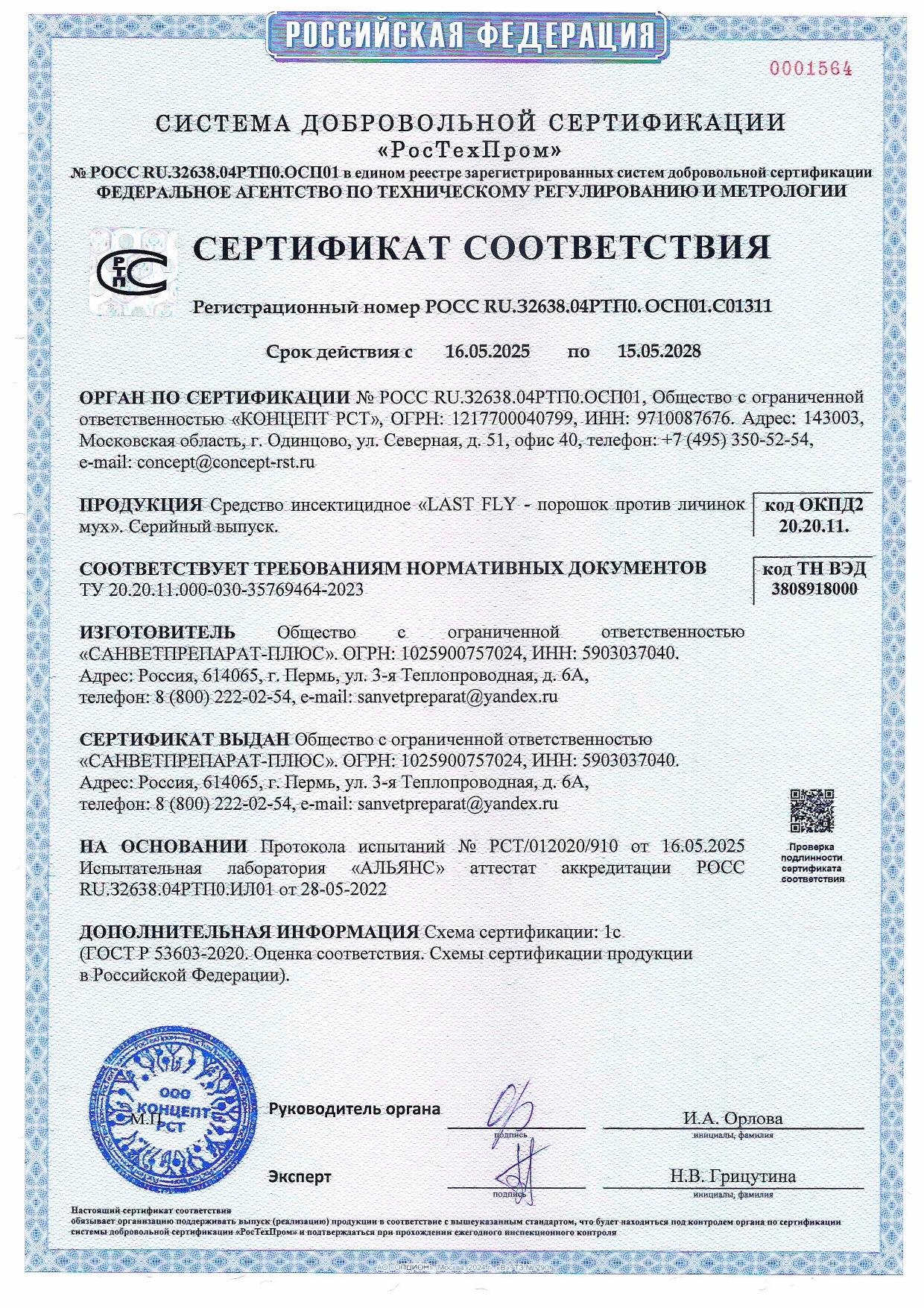 Регистрационный номер № РОСС RU.З2638.04РТП0.OCП01.С01311
